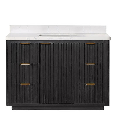 Create an accountThis vanity set offers a sleek and functional upgrade to your main bathroom or guest bath. The cultured marble countertop and solid wood base come in a sophisticated black finish with gold hardware. It includes an undermount ceramic sink and six soft-close drawers, making organization a breeze. We love how the mitered designs on the cabinet and door fronts add depth to your space. With fade-and stain-resistant properties, this vanity is designed to stay looking great. Plus, the rectangular sink and included backsplash add the finishing touches.