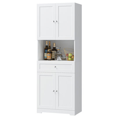 Create an accountUpgrade your kitchen storage with this stylish and functional pantry. Made from engineered wood and finished, it features paneled doors that open to reveal three adjustable shelves for your culinary essentials. The lower drawer provides additional storage space for linens and silverware, while the microwave shelf offers a convenient spot for your handy kitchen appliance. With a weight capacity of 300 lbs. and a tip-over restraint device included, this pantry is designed to keep your items organized and secure. Plus, the silver stainless steel hardware adds a touch of sophistication to your space.