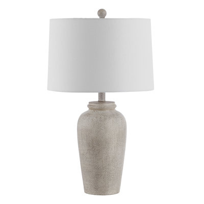 Create an accountThis 26” tall table lamp adds an elegant finishing touch to your living space. It features a gracefully curved body made from a creamy white resin that is textured to look like handmade pottery. The single standard bulb (sold separately) is housed inside the off-white cotton empire shade. We love the round white finial that peeks out from the top. Position this accent lamp on the end table in your living room or den, or consider a pair for the two nightstands in your bedroom.