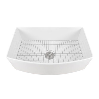 DeerValley Fireclay Curved Farmhouse Kitchen Sink with Sink Grid and Basket Strainer