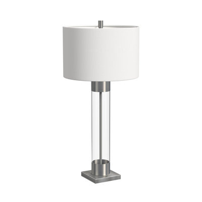 Create an accountThe Tennison Table Lamp is crafted of clear glass and brushed nickel with a white drum shade.