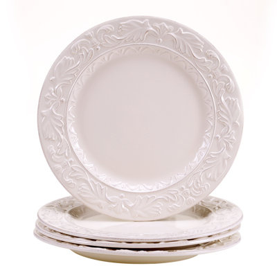 Create an accountOne key ingredient to a home-cooked meal (other than love, of course) is the right presentation – that's why we love this 4-piece dinner plate set. Each one is crafted from glossy cream glazed ceramic with sculpted floral rims, so they're just right for your farmhouse dining room. This food-safe ceramic is also microwave and oven safe, so these dishes make it easy to keep dinner warm before serving or to heat up leftovers. Plus, their stackable design makes them convenient to store. Best of all, when dinner's over, you can put these plates in the dishwasher and get right to enjoying a movie with the whole family.