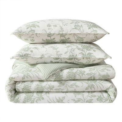 Create an accountJade green is a serenely beautiful color and it brings lovely tranquility to this classic floral toile on a cream cotton ground. Coordinated with a crisp shirting stripe on the duvet cover reverse, this 100% cotton reversible duvet cover set. The home fits easily into a modern bedroom. This gorgeous duvet cover set is 100% cotton and machine washable for easy care. The duvet cover features a button closure with inner ties.