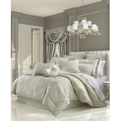 Create an accountUpdate your bedroom decor with the Berlin 4 Piece Comforter Set, that is intricately constructed with a stunning. A dramatic large-scale damask in tones of taupe, champagne, beige, and ivory beautifully adorn the ensemble. Bright shiny yarns are woven throughout the ivory damask and scroll to add luster, dimension and shine. The comforter is piped all around for a decorator's touch and a fine finish. Paired with matching shams and a tailored bedskirt that pulls the beauty all together. Style this bedding collection with the Berlin throw pillows, shams, and window treatments for a complete look.