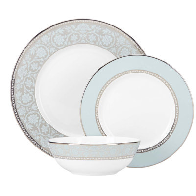 Create an accountA timeless combination of polished platinum and white bone china creates the distinctively elegant Westmore dinnerware. The Westmore 3 piece Place Setting features the delicate motif of intricate blooms on a serene blue background. Includes dinner plate, salad plate and bowl. Dishwasher safe.