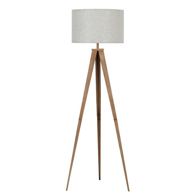 Create an accountThis 61" tall tripod floor lamp brightens up reading corners or bedroom walls. Its three-legged, tripod-inspired design is made from metal in a neutral finish that goes well in any modern space. The drum-shaped shade on the top boasts a light hue, and it accommodates one medium-base bulb up to 60W (not included) that aims to light up and down wherever it stands. Best of all, it features a handy footswitch that allows you to easily turn the light on and off.
