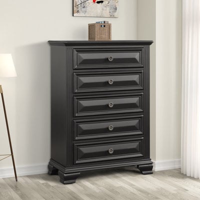 Create an accountFeel at home with the Renova 5-Drawer Chest's traditional stylings that feature a vintage black finish with wood tone rub through and raised frames on wide beveled drawer fronts. This five-drawer chest boasts adorable rosette knob hardware in a brass finish, fancy fluted pilasters along the sides, and sturdy French bracket foot bases.
