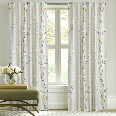 Create an accountClassic and elegant Japanese nature inspired cherry blossoms tree print window curtains set in tan, charcoal and yellow ochre on a pale taupe grey background. Oriental Chinoiserie Chic Drapes.