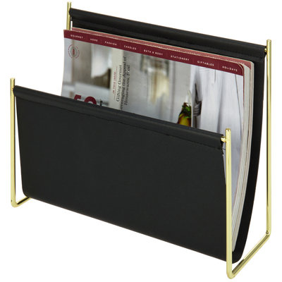Create an accountFeaturing a striking vintage brass-tone metal construction with black leatherette sling, the magazine holder basket rack could keep your magazines, documents and other reading materials efficiently organized without taking up valuable space. Ideal for storing papers, mail, magazines, books, supplies and so much more. Can be placed on the countertop or simply freestanding next to any couch or armchair. Plated metal frame design paired with a premium faux leather sleeve.