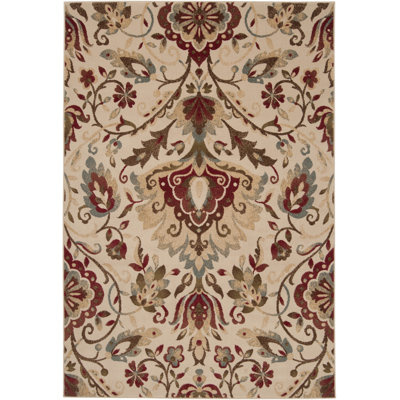 Create an accountDisplaying a lovely floral-inspired motif in a warm color palette, this alluring area rug sets a stunning foundation in any abode. Machine-woven in Turkey, this polypropylene piece is the perfect anchor for a high-traffic space in your home. Start a comfortable seating group with a clean-lined linen sofa and a pair of tufted armchairs, then roll out this design to give the ensemble a pop of pattern. Its soft cream and rich burgundy hues bring sophistication and charm to your arrangement, especially when you top it with a walnut coffee table that enhances its traditional appeal. Once you love your layout, adorn a nearby window with sheer curtains that let in lots of natural light, then tuck a lush fern into an unused corner for a fresh finishing touch that complements this rug’s botanical beauty.